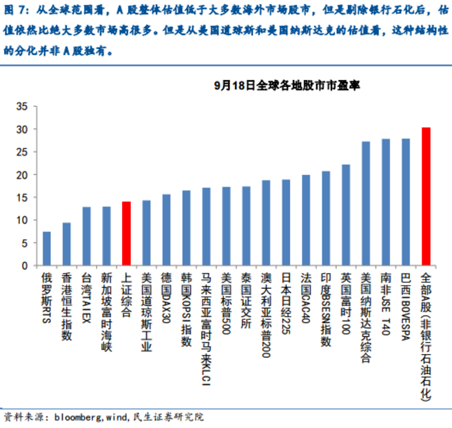 民生证券李少君策略团队认为,与历史水平相比,全部A股估值已经处于 35%的较低分位数位置;与海外市场相比,A股估值低于大多数海外市场股市;与其它资产相比,A股盈利收益率优于理财、国债、住宅投资。但是,排除金融股之后的A股估值并不便宜。结构上,不性感的不贵、性感的不便宜。